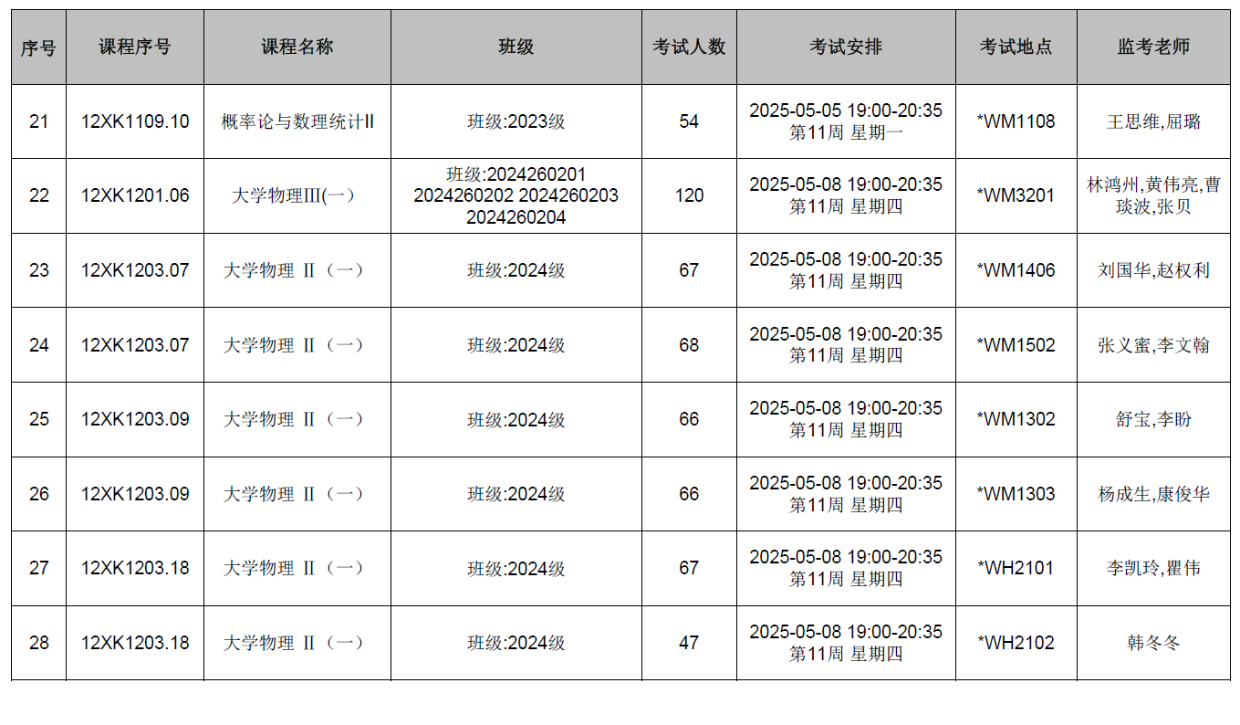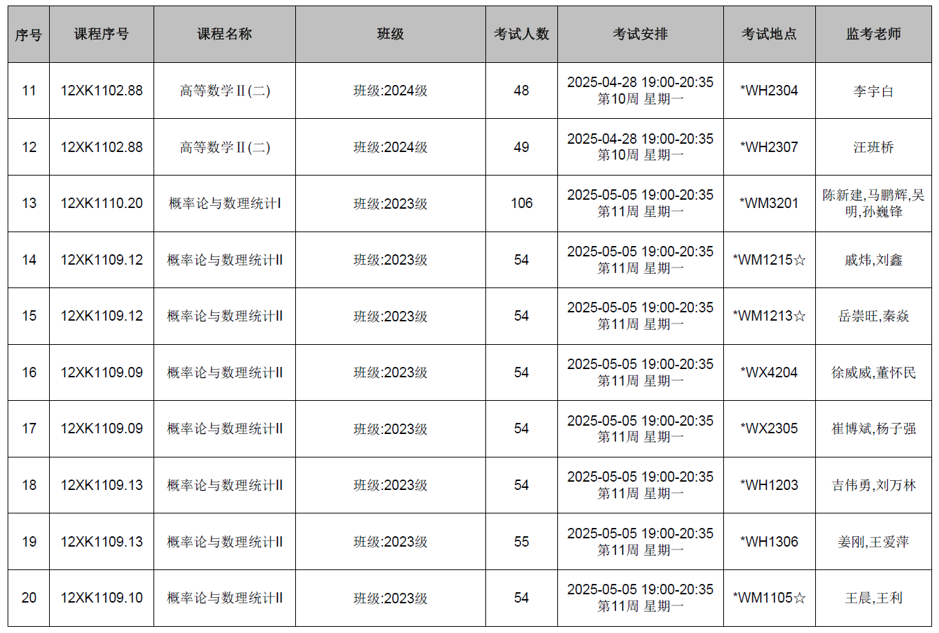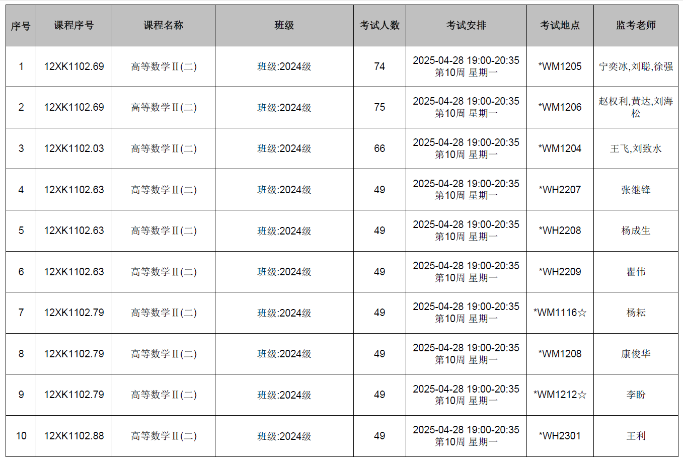 2024-2025-2学期高等数学、概率论与数理统计、大学物理期中考试安排已发布,监考安排澳门金沙娱乐城app 已经在本科教务系统中填报完成(监考教师可同时在本科教务系统中查看监考安排)。为确保考试平稳顺利进行,澳门金沙娱乐城app 已将相关监考工作安排表上传到附件中,请各位老师及时下载查阅,并按时完成监考工作。