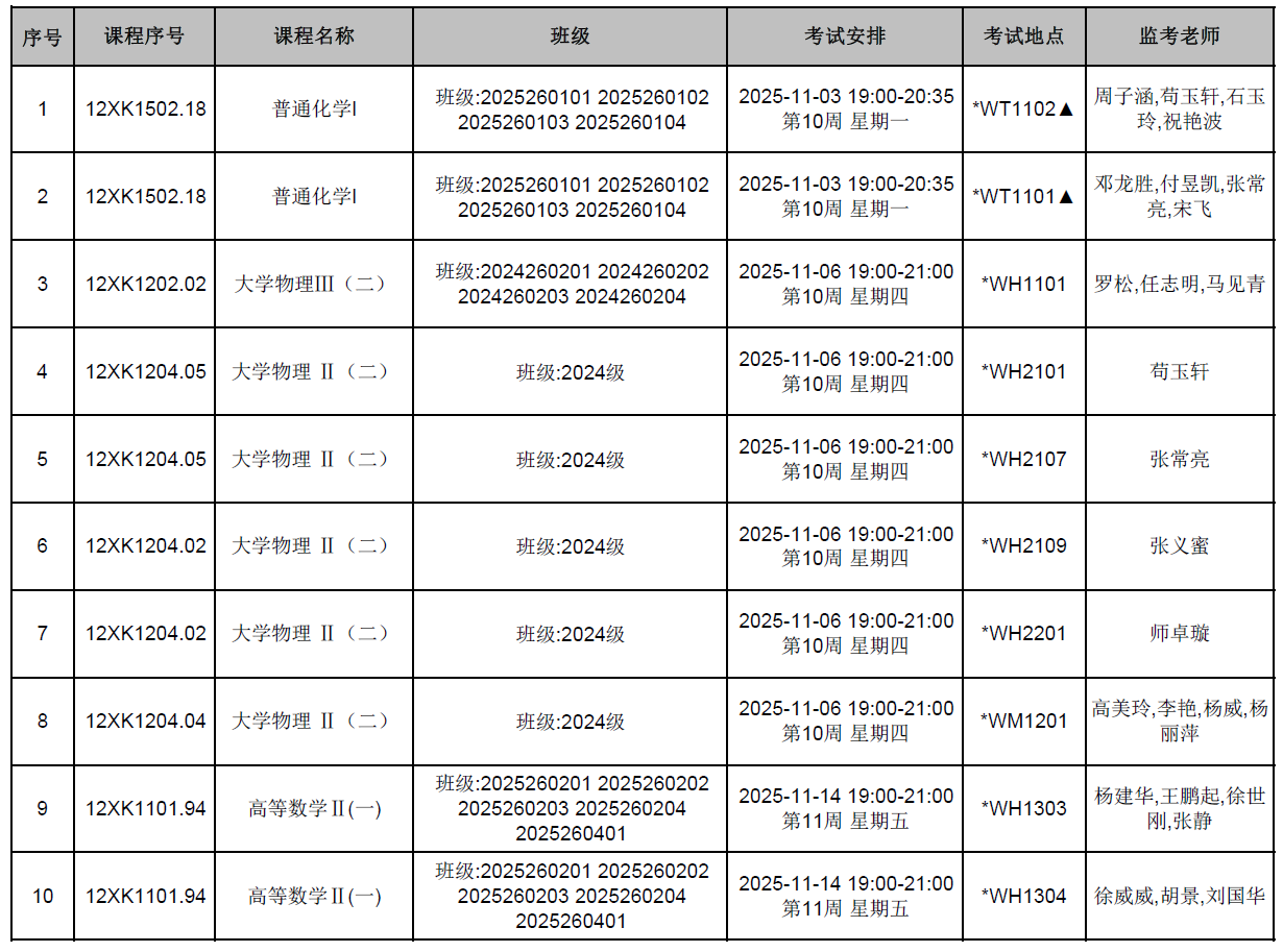 2025-2026-1学期高等数学、大学物理、普通化学期中考试安排已发布,监考安排澳门金沙娱乐城app 已经在本科教务系统中填报完成(监考教师可同时在本科教务系统中查看监考安排)。为确保考试平稳顺利进行,澳门金沙娱乐城app 已将相关监考工作安排表上传到附件中,请各位老师及时下载查阅,并按时完成监考工作。