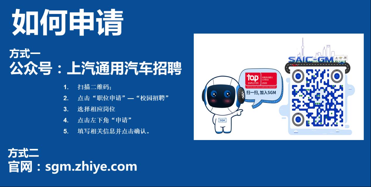 1. 上汽通用汽车有限公司网申系统(sgm.zhiye.com)→校园招聘→所属公司“上汽通用东岳汽车有限公司”→ 选择“2022届上汽通用东岳基地招聘-电气自动化类”岗位